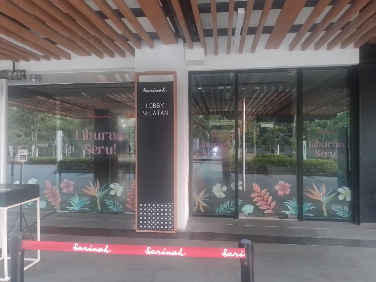 Branding Event Mall di Sarinah Thamrin, Jakarta Pusat dengan menggunakan spesifikasi bahan stiker unggulan dengan media di kaca menggunakan jenis sticker transparan, backwall dan lift menggunakan sticker blockout